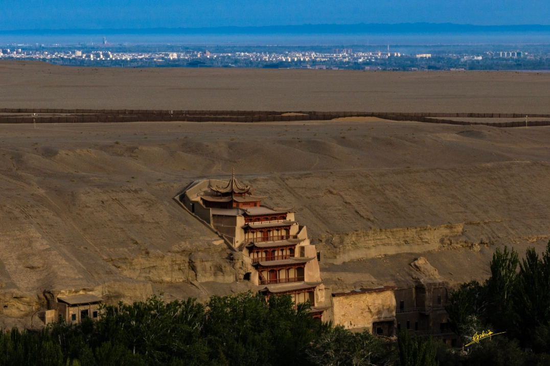 “我的镜头,一直在寻找历史与现实交汇的那个点。”他分享其标志性作品《等待十年》的诞生故事。一句古籍中“莫高窟距沙洲东南25里”的记载,成为他多年执念的起点。他无数次尝试,只为找到一个能将千年莫高窟与现代敦煌城纳入同一画面的角度。最终,在一个雨后初晴、尘埃落定的黄昏,他操控大疆御3无人机,在南天门附近开启7倍长焦,精密堆叠约十张影像,让清晰的洞窟轮廓与远方城市的楼宇群在取景框中历史性地相遇。